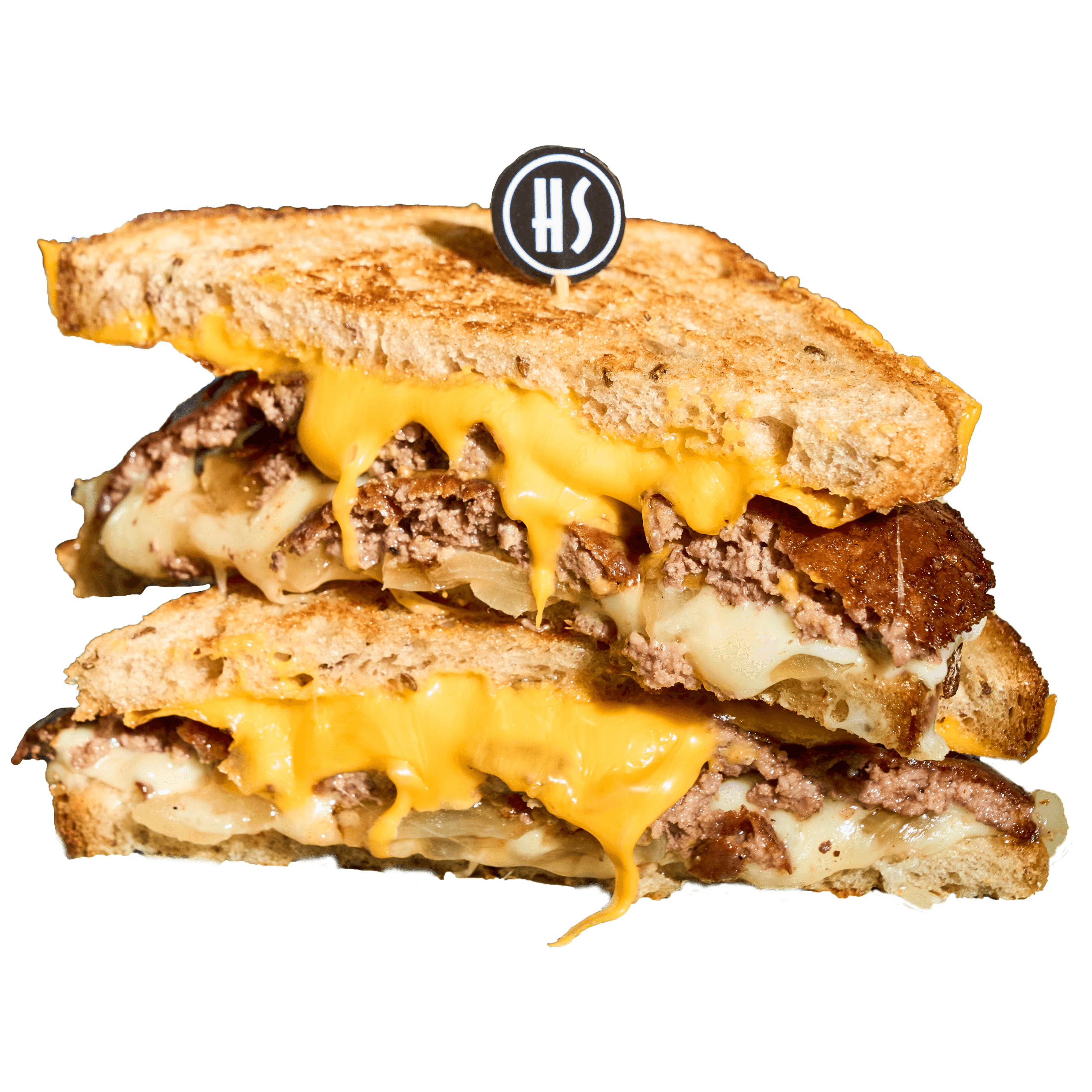 Old-school patty melt, featuring two beef patties, grilled onions, Swiss, American, pickles, and special sauce on grilled rye bread